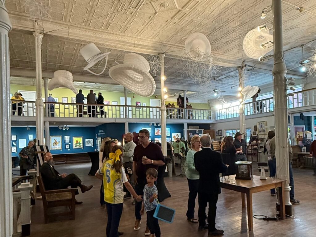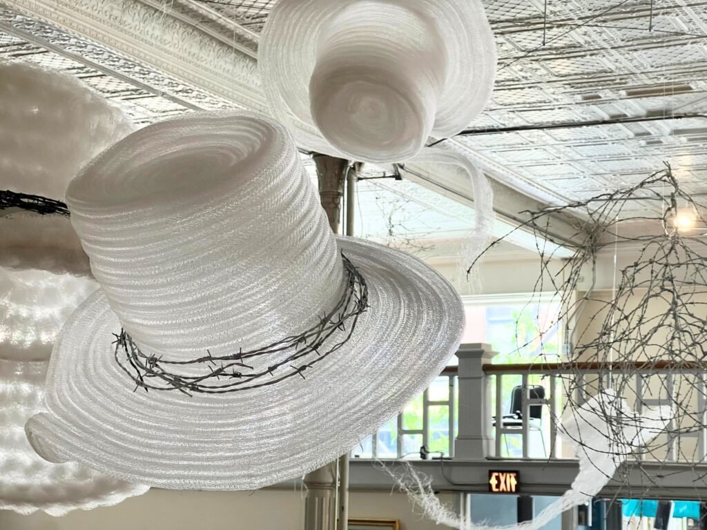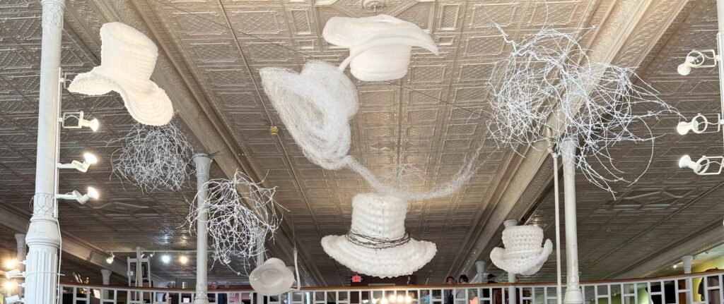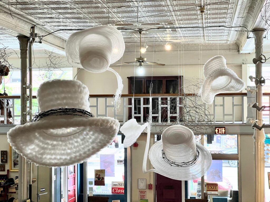 Stampede is a site-specific suspended installation composed of oversized cowboy hats and tumbleweeds, rendered in industrial materials traditionally associated with the Western landscape. The hats—varying in scale and orientation—are constructed entirely from fishing line, first knitted into thick rope and then shaped through a combination of oversized knitting, crochet, and hand-stitching. The work occupies vertical space, with elements hung from a second-story ceiling so that forms appear airborne, as if lifted and scattered by the force of a passing stampede.